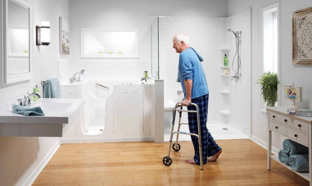 Walk-in tubs, also called accessible baths or safety baths, are a great option. As the name implies, they’re easy to step into, verses having to lift your leg over the side of the tub. Plus, since you’re sitting in a more upright position, there’s also less up and down movement than a traditional bathtub. Overall, this reduces the chance of slipping and minimizes pain for those with limited mobility or range of motion. These walk-in baths often include hydrotherapy options which can be great for sore muscles and injury recovery as well.
